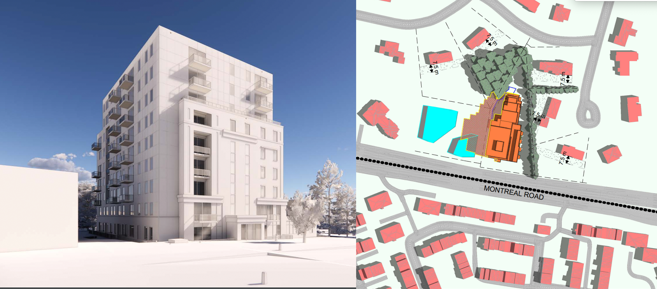 An application to construct a nine-storey, mid-rise residential building with 130 units has been submitted for the property at 1815 Montreal Road, located on the north side of the street south of Cedar Road and Rothwell Drive.